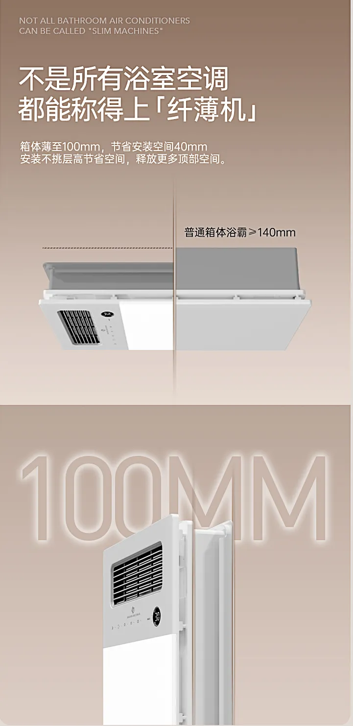 100mm纖薄箱體設計,安裝不挑層高,釋放更多浴室空間,給你帶來舒適的視覺感受,大大提升了時尚感和實用性。